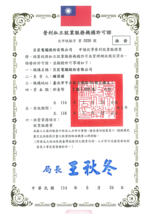 | 就業服務許可 | 臺北市政府 | 營利私立就業服務機構許可證 |
